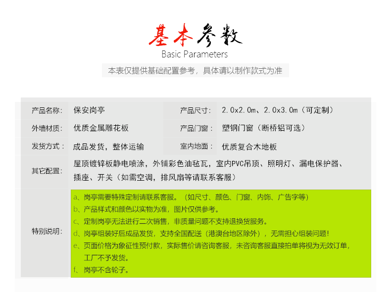 上图常规尺寸为:2.0*2.0 ,2.0*3.0 (可定制),保安岗亭材质为金属雕花板,