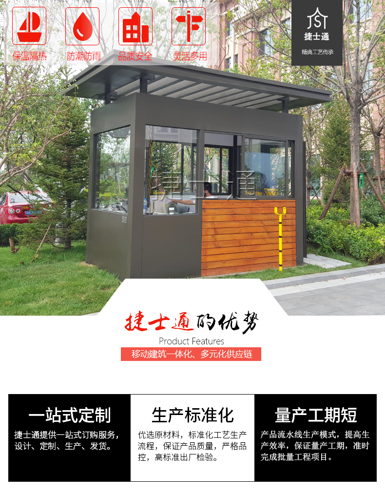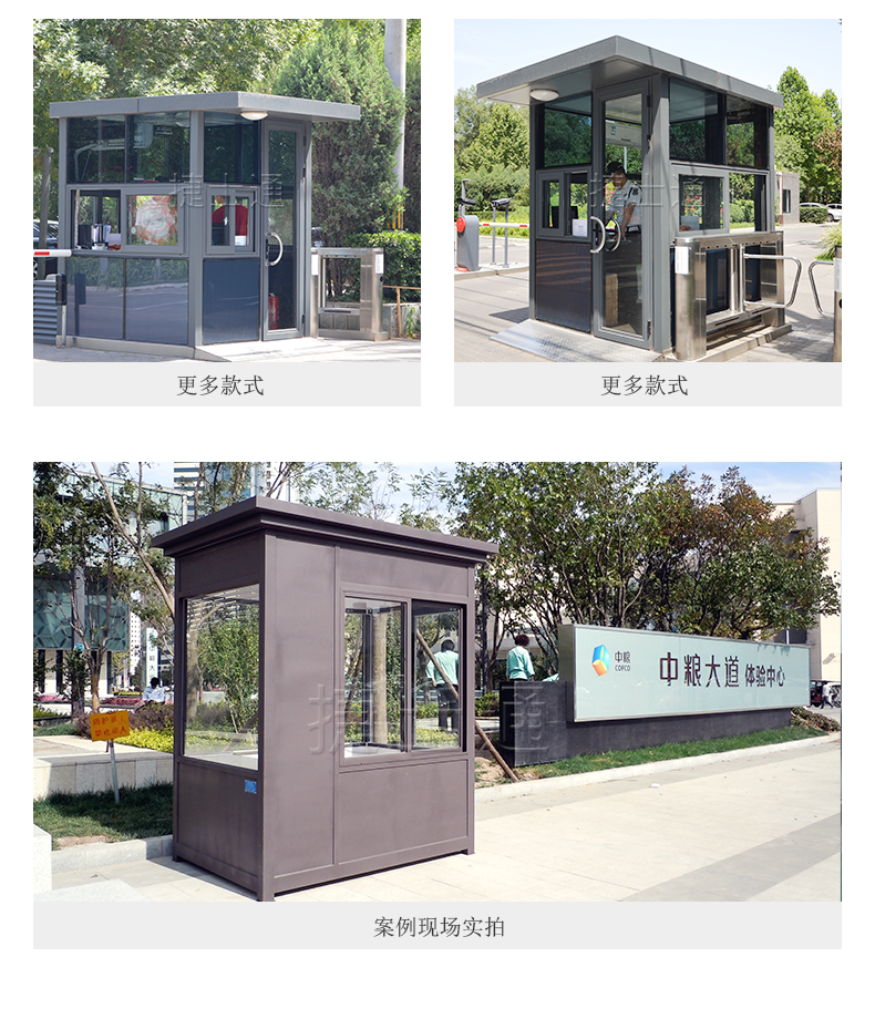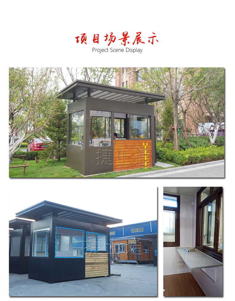 公司主要产品:收费岗亭,治安岗亭,门卫值班室、售卖亭、售票亭、信息服务亭、综合办公室、朗读亭等,