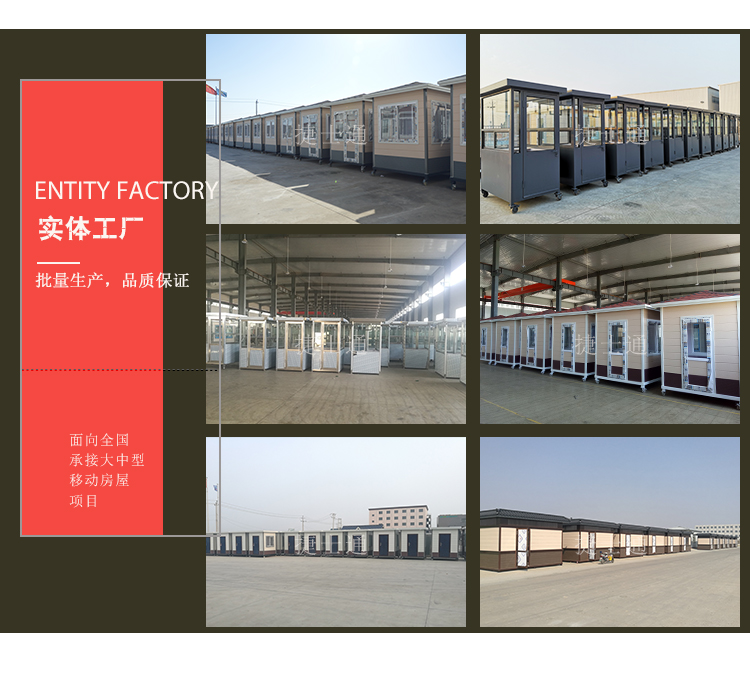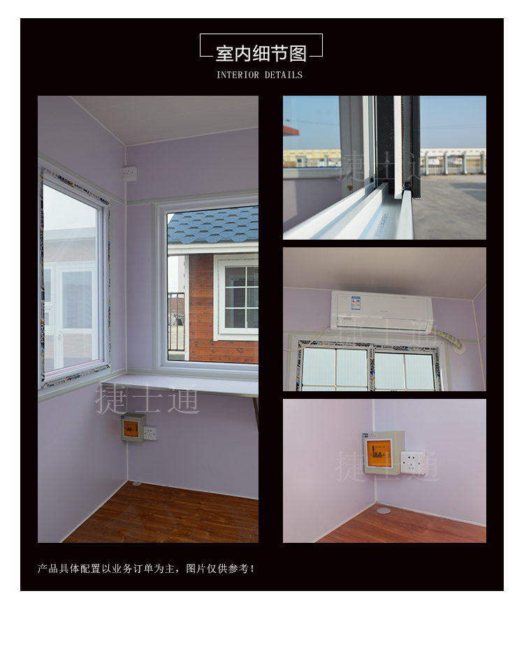 顶部:不锈钢管、防水卷材、PVC扣板顶部材料采用特殊防水铰接工艺,彻底解除漏水之患;门窗:铝合金移窗、地弹簧门 ;墙体:龙骨焊接而成