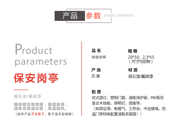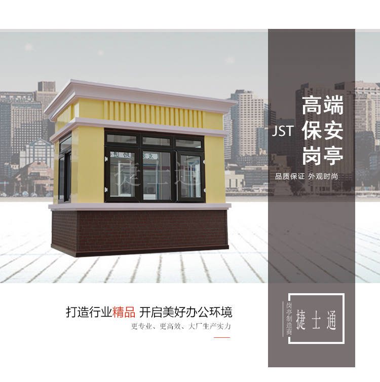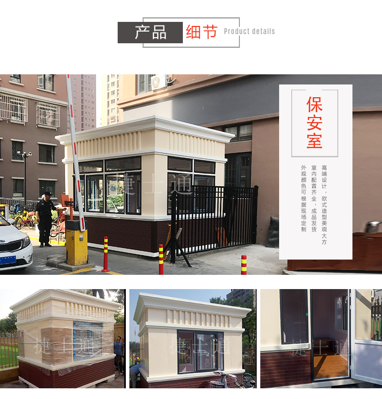 保安亭整个高度比常规岗亭要高很多、顶部采用双层顶、隔热保温效果好、而且中间镂空的地方可以安装岗亭外机、既起到美观的作用、还能让空调外机安装在顶部、很是实用、让美观和实用相结合。此款为真石漆材质,质感好、易造型,其手触摸有强烈的砂质感,且颜色不像固定的石材可根据自己的喜爱来取决颜色;耐水、耐候、抗老化性能强,抗裂防渗,有韧性,粘结力强,砂子混合在一起能阻挡细微的裂纹从而起到防渗防水作用,其成分经过试验的反复研究和市场的考验,能使用各种恶劣环境,且有20年以上的耐候期。联系电话:15822882616,公司网址:elpoderdeelectro.com
